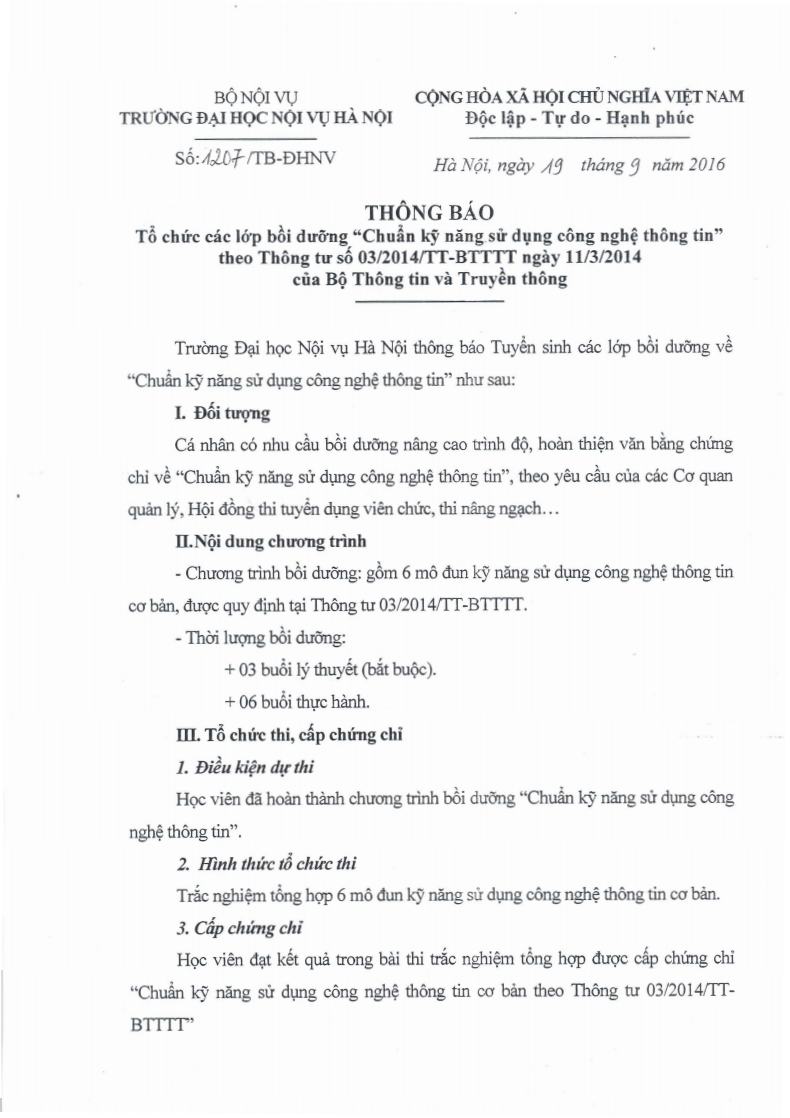 THÔNG BÁO: TỔ CHỨC CÁC LỚP BỒI DƯỠNG " CHUẨN KỸ NĂNG SỬ DỤNG CNTT THEO THÔNG TƯ 03/2014/TT-BTTT"