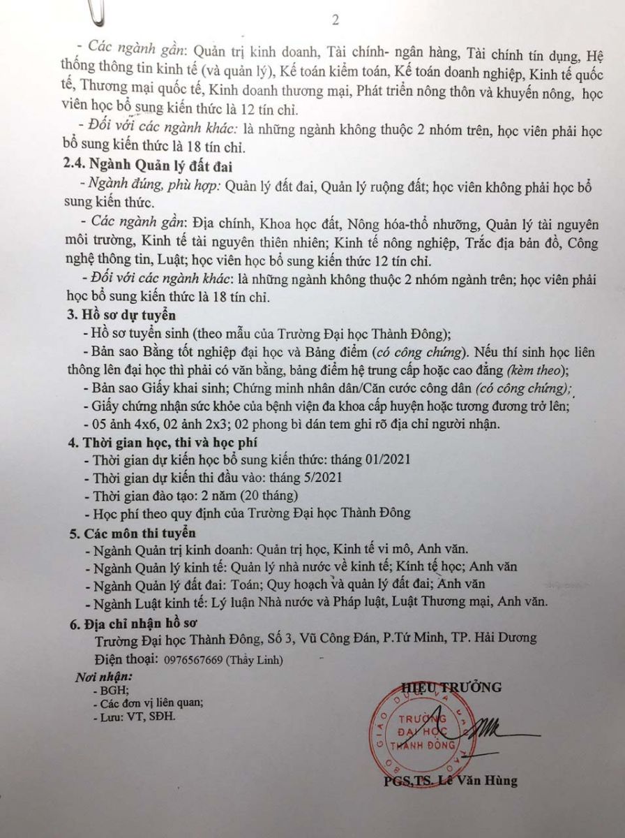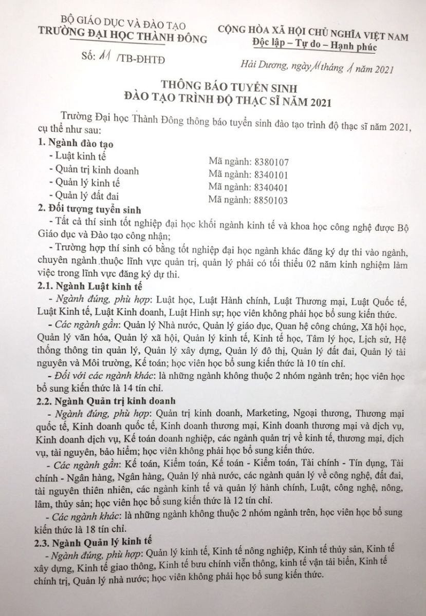 Trường đại học Thành Đông thông bao tuyển sinh trình độ thạc sĩ các chuyên ngày như sau: